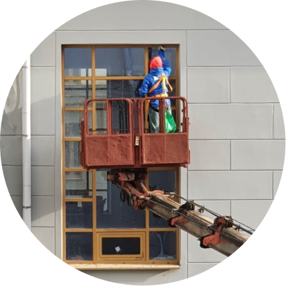 Производим мойку фасадов с 1 этажа с помощью специального оборудования, с помощью мех руки там где достать с 1 этажа нет возможности. Для высотных работ привлекаем профессиональных альпинистов с разрешением работать на высоте.